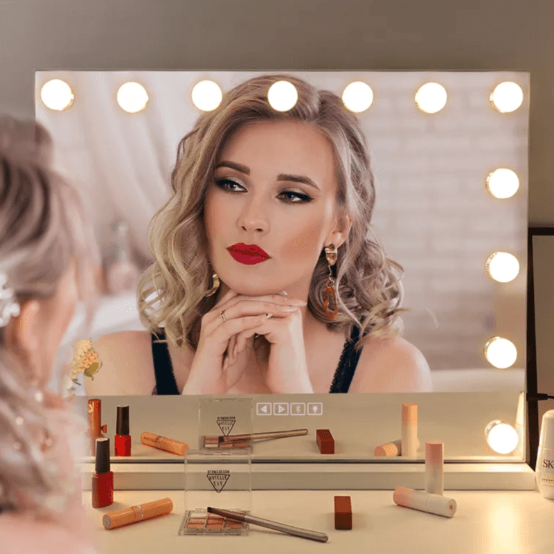 Nett, praktisk og lekkert sminkespeil med justerbart lys i både styrke og tone. 9 G35 LED pærer. Touch panel. Fåes i både sort, hvit og sølv. Justerbar vinkel. Integrert mobilholder (kan fjernes).