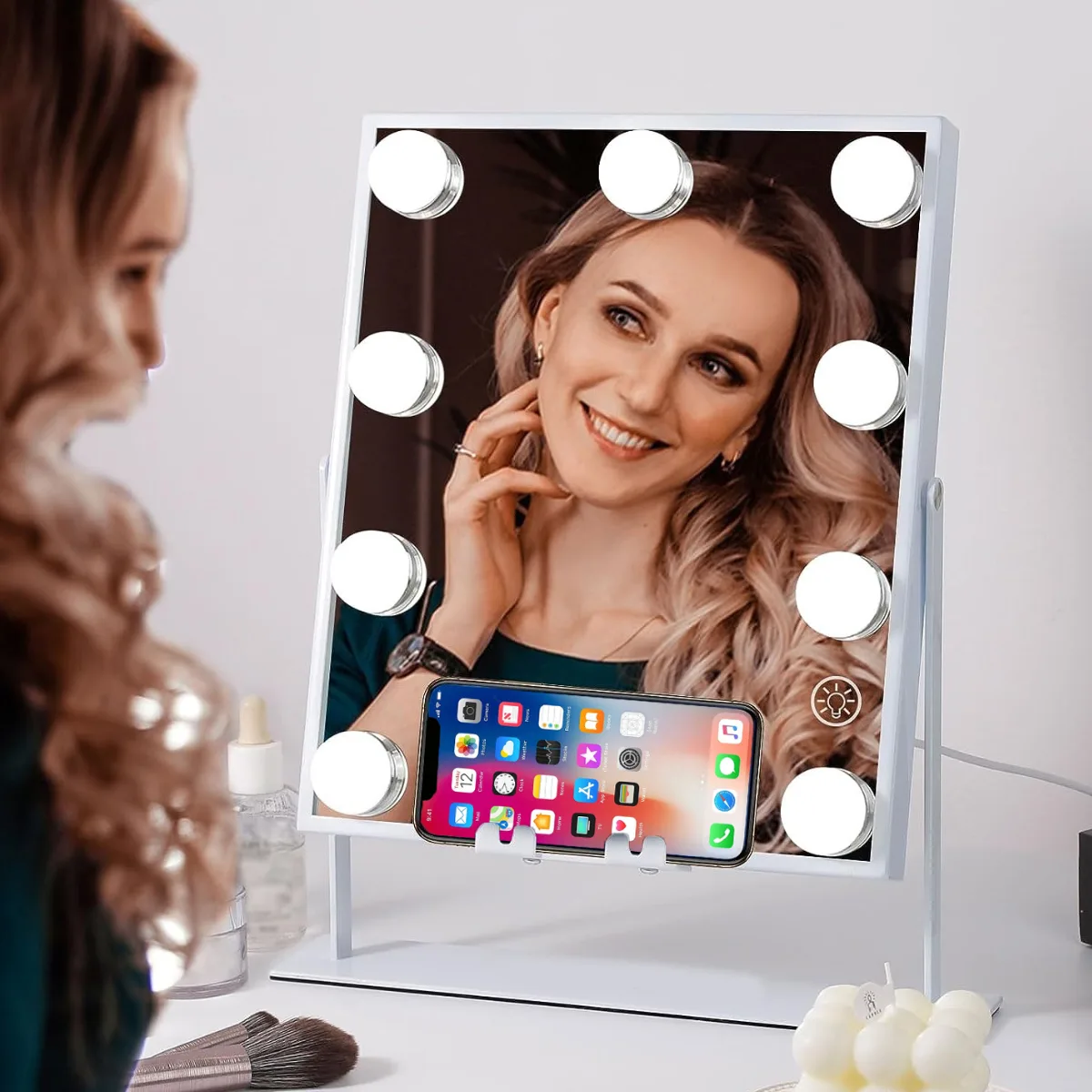 Nett, praktisk og lekkert sminkespeil med justerbart lys i både styrke og tone. 9 G35 LED pærer. Touch panel. Fåes i både sort, hvit og sølv. Justerbar vinkel. Integrert mobilholder (kan fjernes). Størrelse 25x30cm