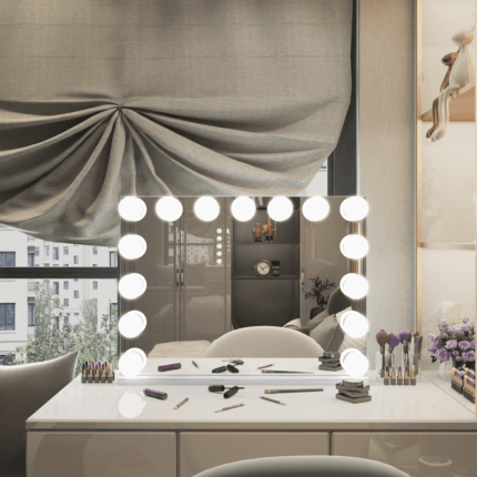 Profesjonelt og lekkert sminkespeil for plassering på sminkebord eller kommode. 15 stk G95 LED lyspærer. Laget i solid materiale av glass, metall og MDF. Lysene kan justeres i styrke og modus med varmt eller kaldt lys for perfekt lys morgen som kveld. Fås i sort eller hvit utførelse. Størrelse 110x80cm